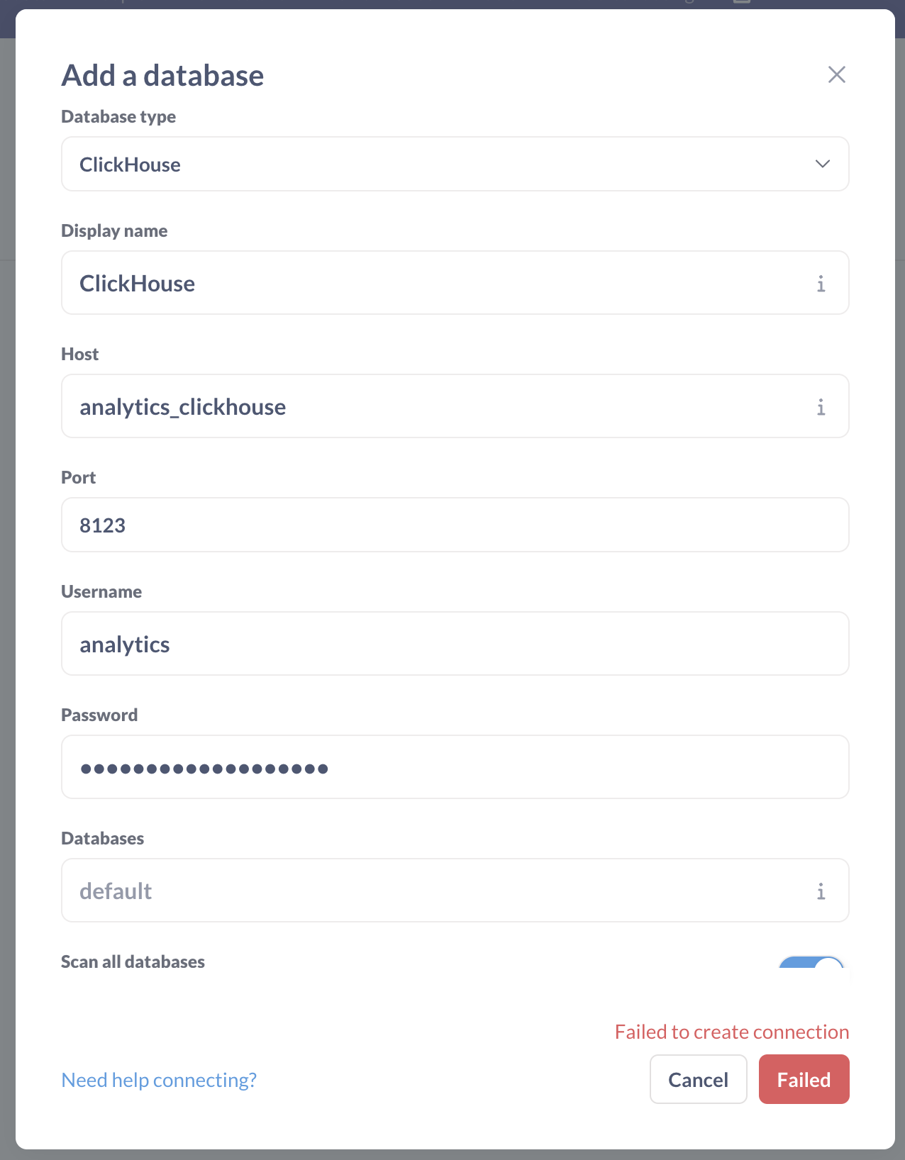 When I’m trying to connect from metabase to ClickHouse (both self-hosted) I’m getting this error: “Failed to create connection“. Tried lower version of MB and CH, any combination didn’t work. Host resolution works fine when trying to connect from container to container with /ping.