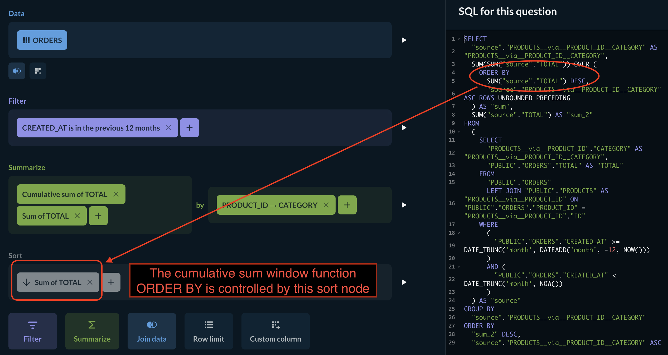 Here’s the cumulative sum notebook from Sample Database showing the effect – flip the sort direction to see it also change in the window function: