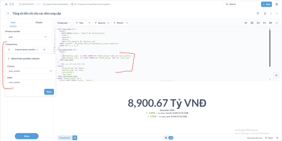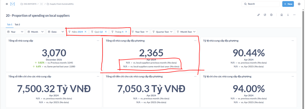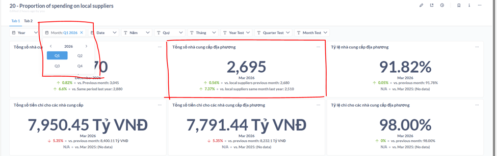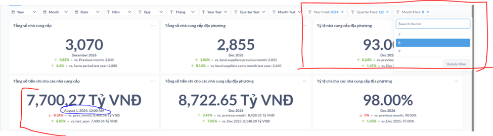 Description: Trend Charts correctly display "vs. Previous Month" or "vs. Previous Year" when no filters are applied or when only a "Year" filter is used. However, when more granular filters (e.g., Year + Month) are applied, the comparison functionality breaks.
