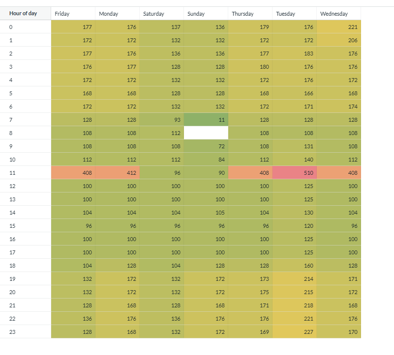 I have made a pivot table with hour of the day on the y axis and Day of the week on the x axis