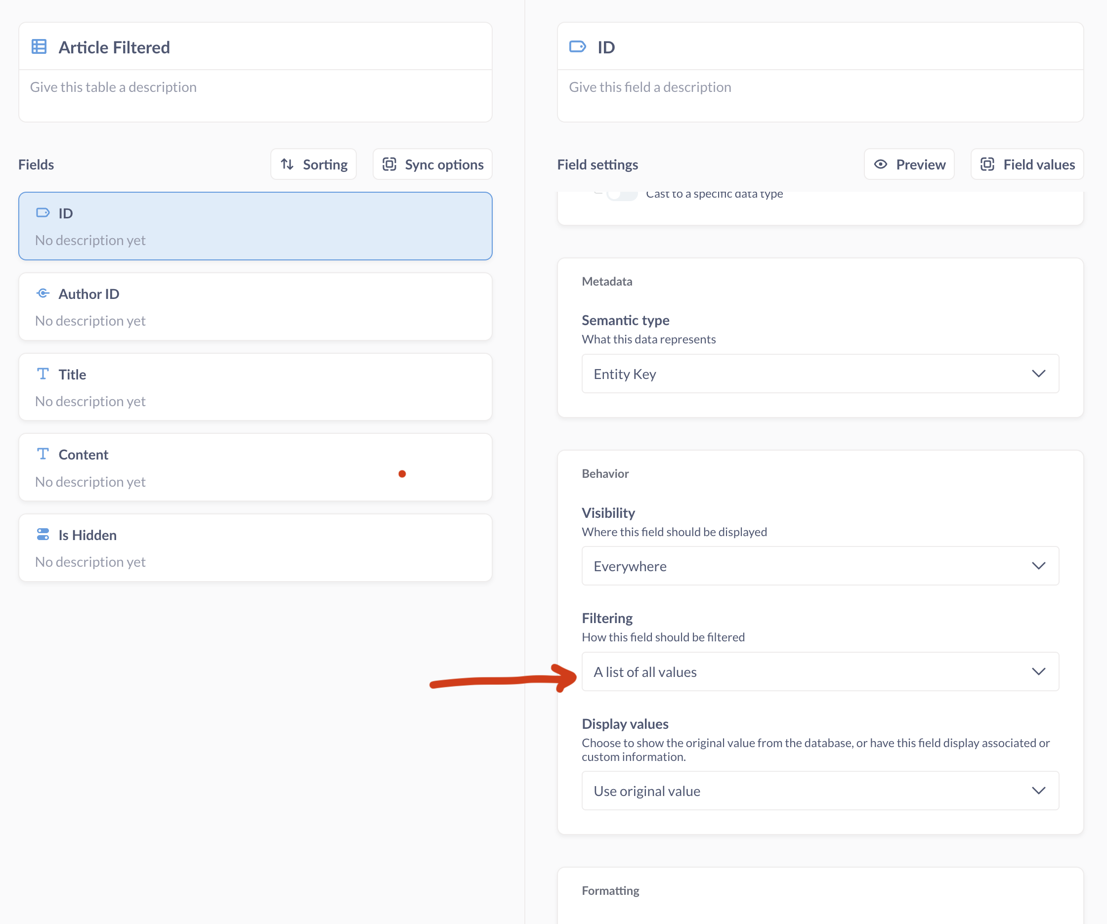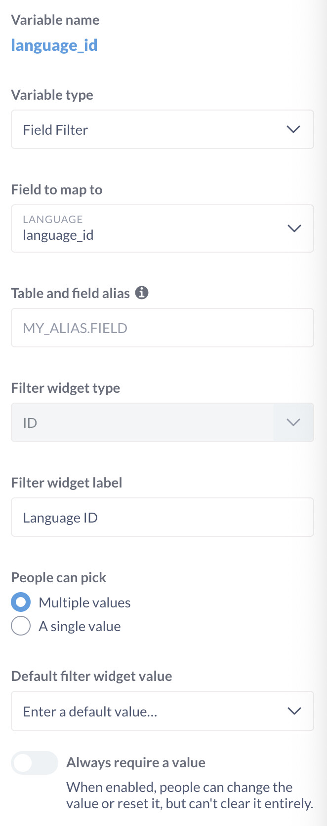 Using the Table Metadata panel in Admin, set a column as an Entity Key and another as Entity Name. Create a dashboard filter of type ID using the Entity Key column. In the filter’s dropdown, the Entity Name will appear in the filter.