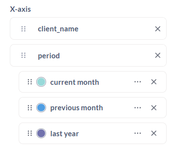 I’ve got a chart now which charts data from previous month, month before prev. and the previous month last year. Its a bar chart grouped by client and by the above. So a bar chart where each client has three bars grouped together.