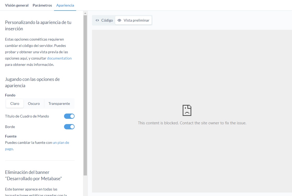 Also, when i try to preview the dashboard in the embedding menu i get 'This content is blocked. Contact the site owner to fix the issue.'