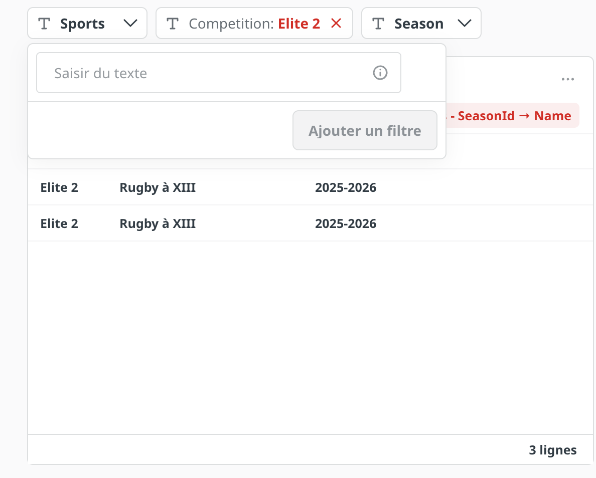 I have three filters: Sport, Competition, and Season, all linked to each other.