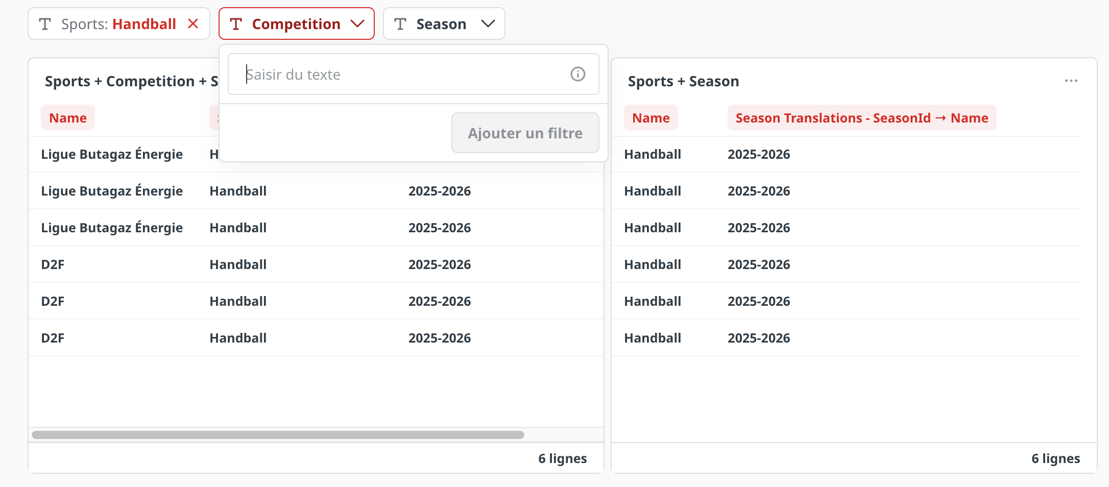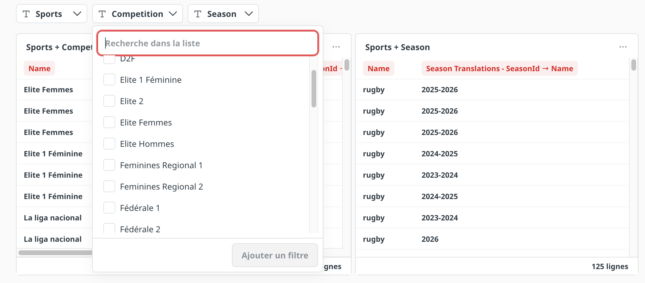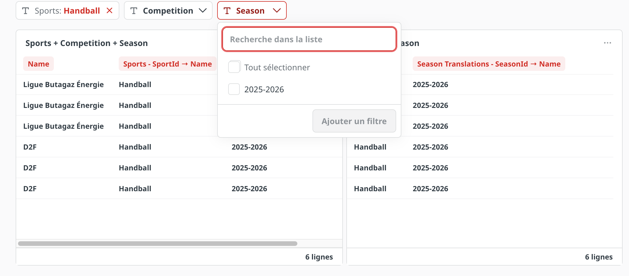 When I filter by Sport (e.g., Handball), all corresponding seasons appear correctly in the database.
