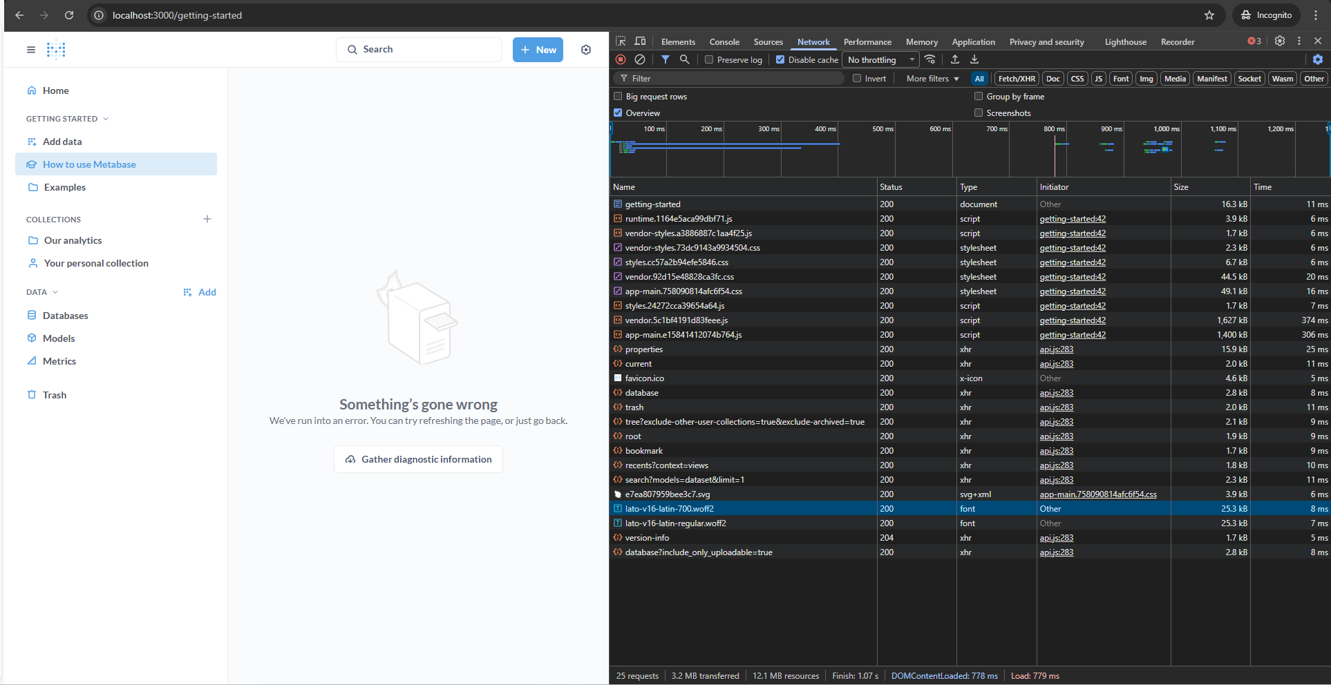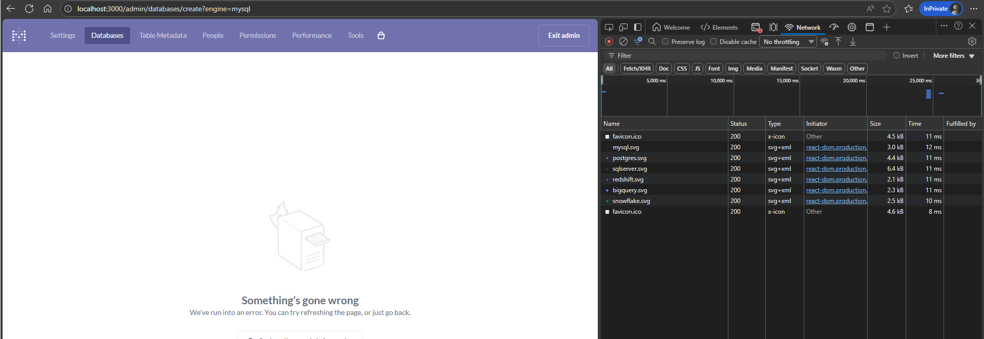 Check the browser dev tools for the API call response and make sure it is actually from Metabase and not something else, or something else isn’t corrupting the response or returning its own error instead.
