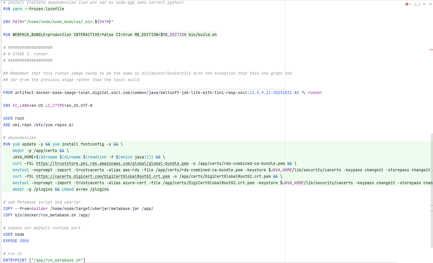 Hi @TonyC .First, I downloaded the source code for version 0.56.13. Next, I removed the Vertica-related code under modules/drivers and modified the deps.edn file to exclude Vertica dependencies. Then, I updated the Dockerfile and used it to build my image, generating the metabase.jar file.Flowing is my dockerfile: