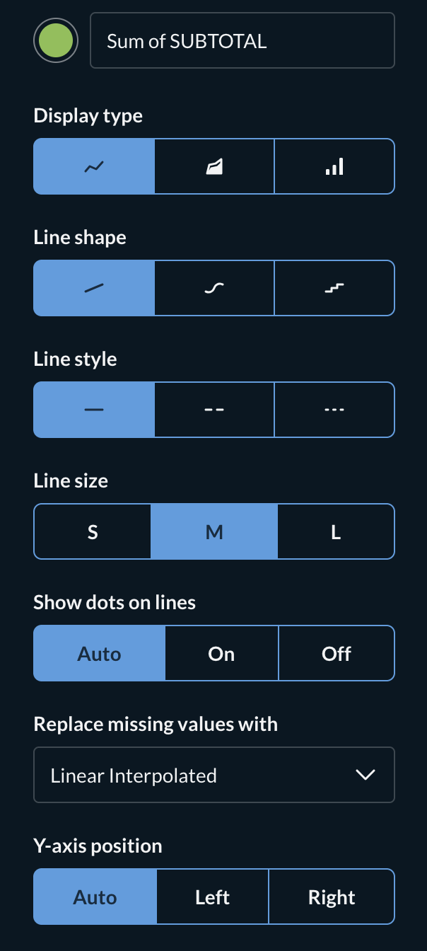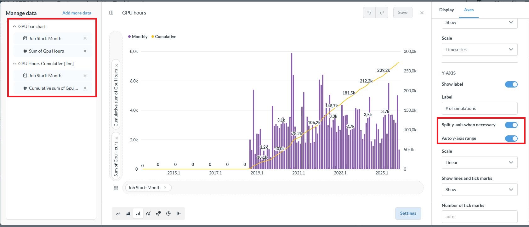 Since the cumulative tends to grow much more than the monthly, I select “split y-axis when necessary”. It does split the axis in the preview (see screenshot) but then when on the dashboard the y-axis is not split.