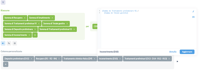 In the second screenshot we changed the order of the aggregations and Incenerimento(D10) became [Somma di Trattamenti preliminari R] / [Somma di incenerimento], still the aggregation in third place divided by the aggregation in the fourth place even if we initially put a different column name in the function.