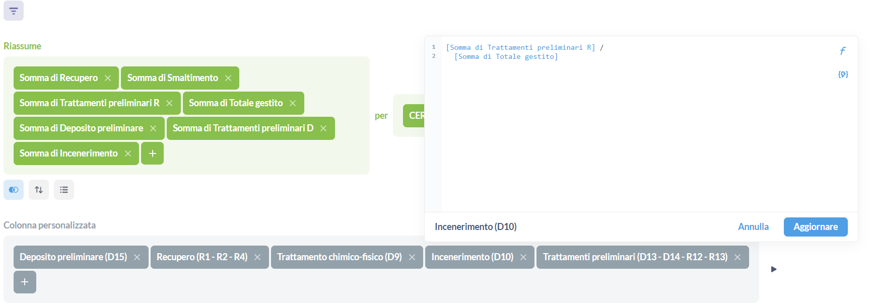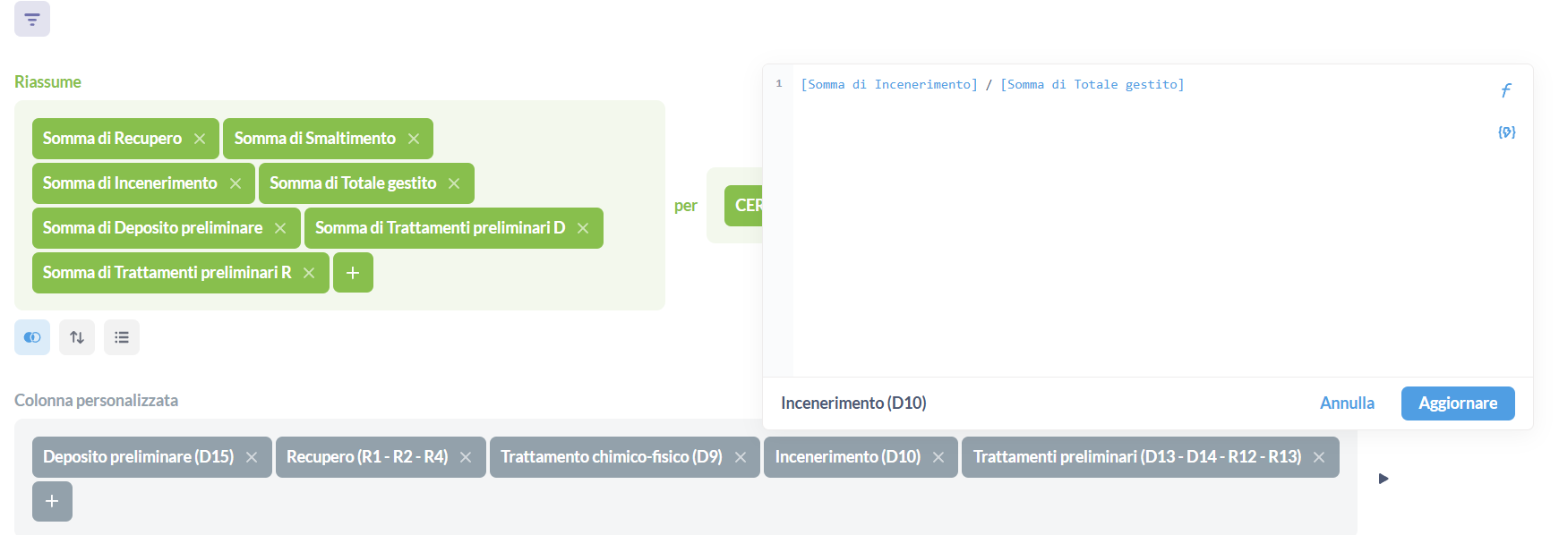In the first screenshot the column Incenerimento (D10) is [Somma di Incenerimento] / [Somma di Totale gestito] so the aggregation in third place divided by the aggregation in the fourth place.
