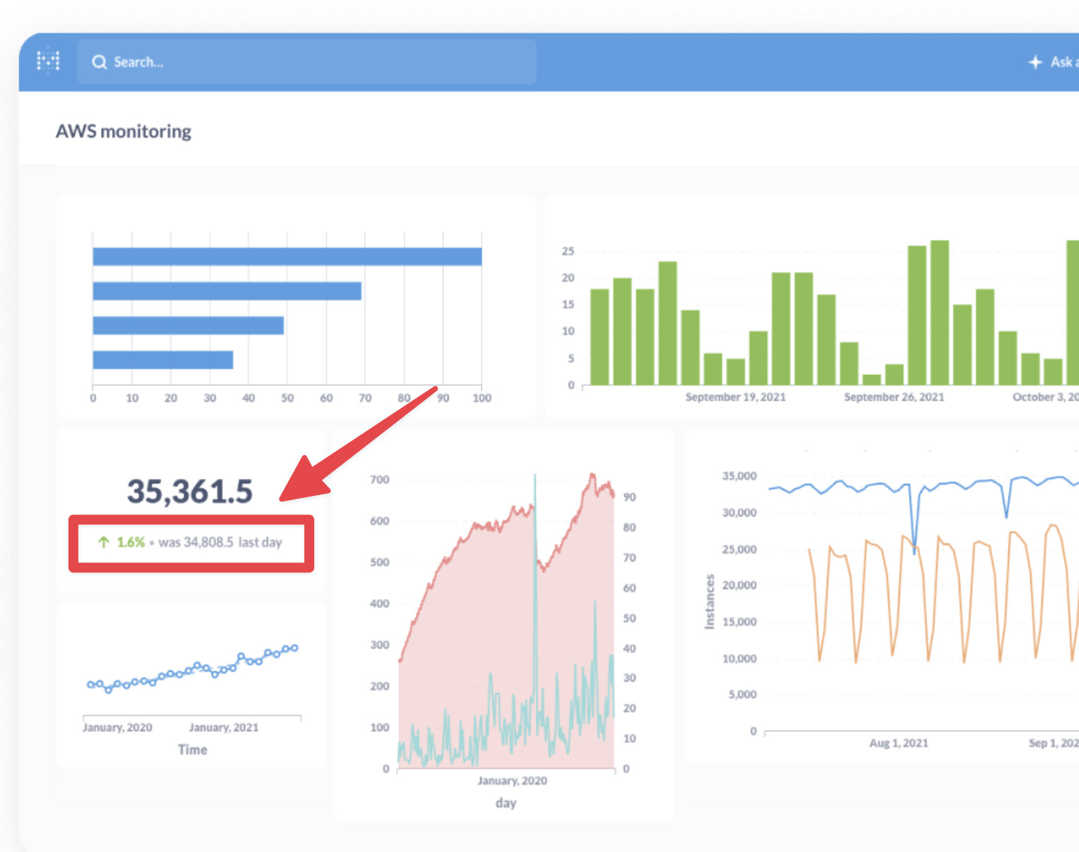 What's the best way to implement change over time within cards in Metabase as shown in one of the dashboard examples provided below: