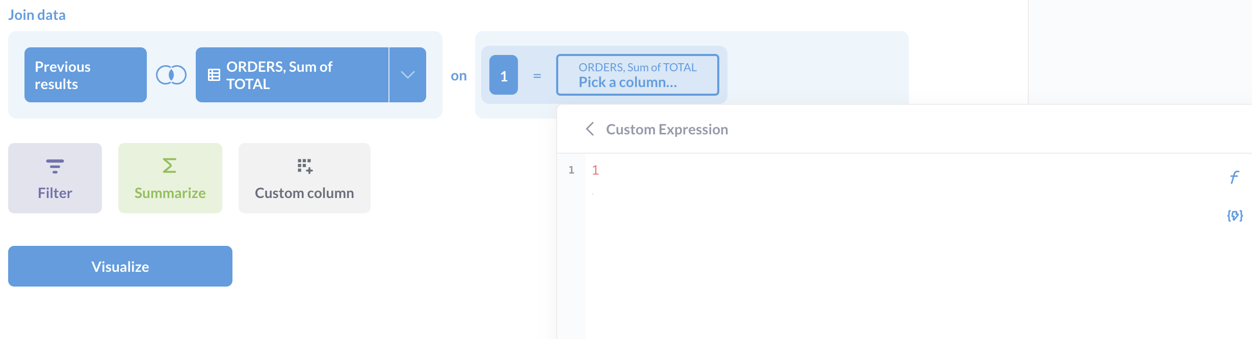 Write a second question that inner joins the first using a 1=1 condition. To access the custom condition, select Custom Expression from the join condition dropdown and just enter the number ‘1’ in the box. Do this for both sides of the condition (and leave the operator as '='):