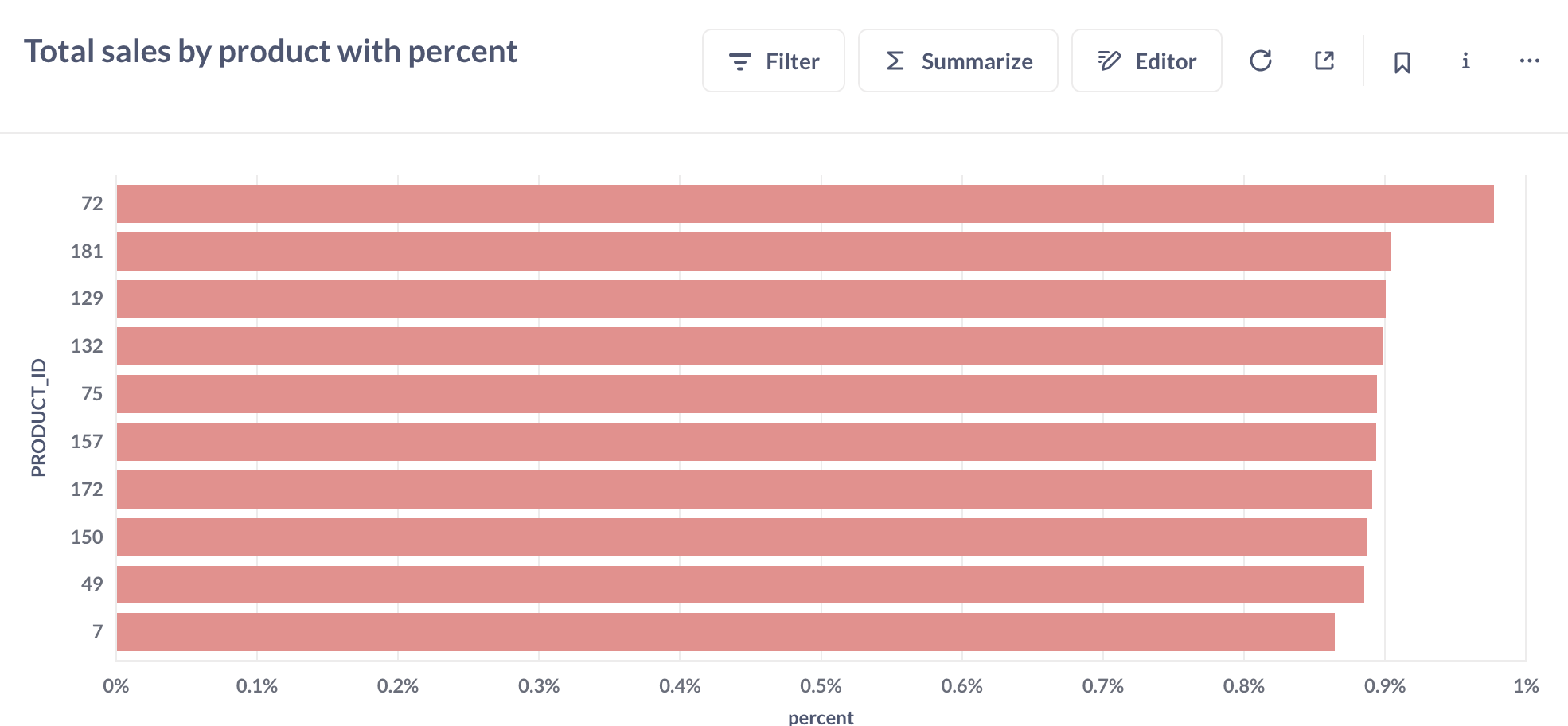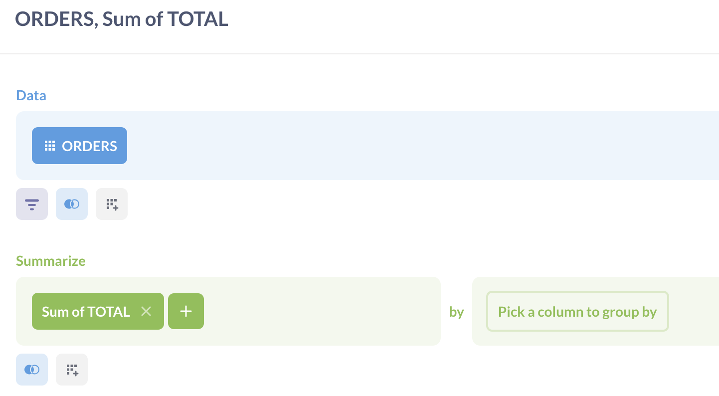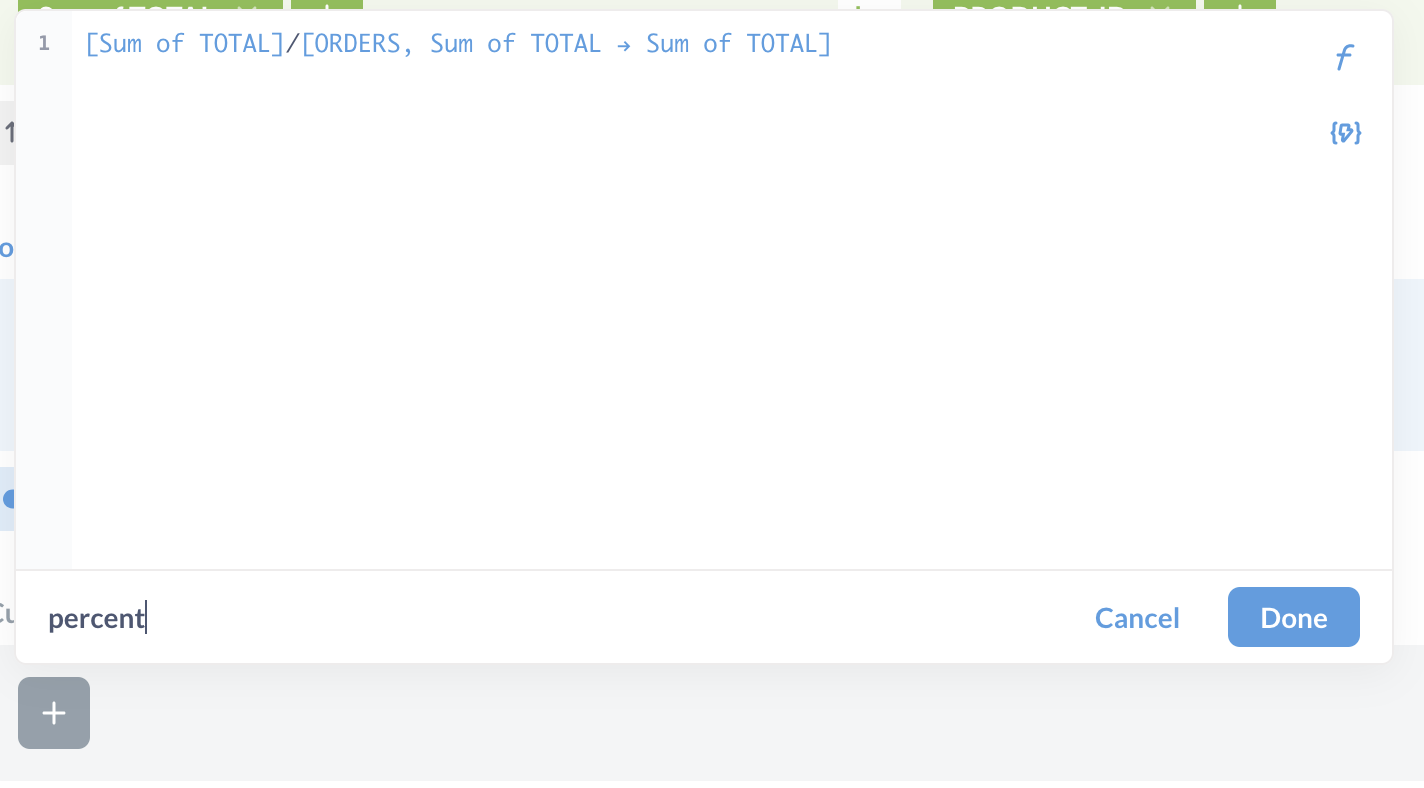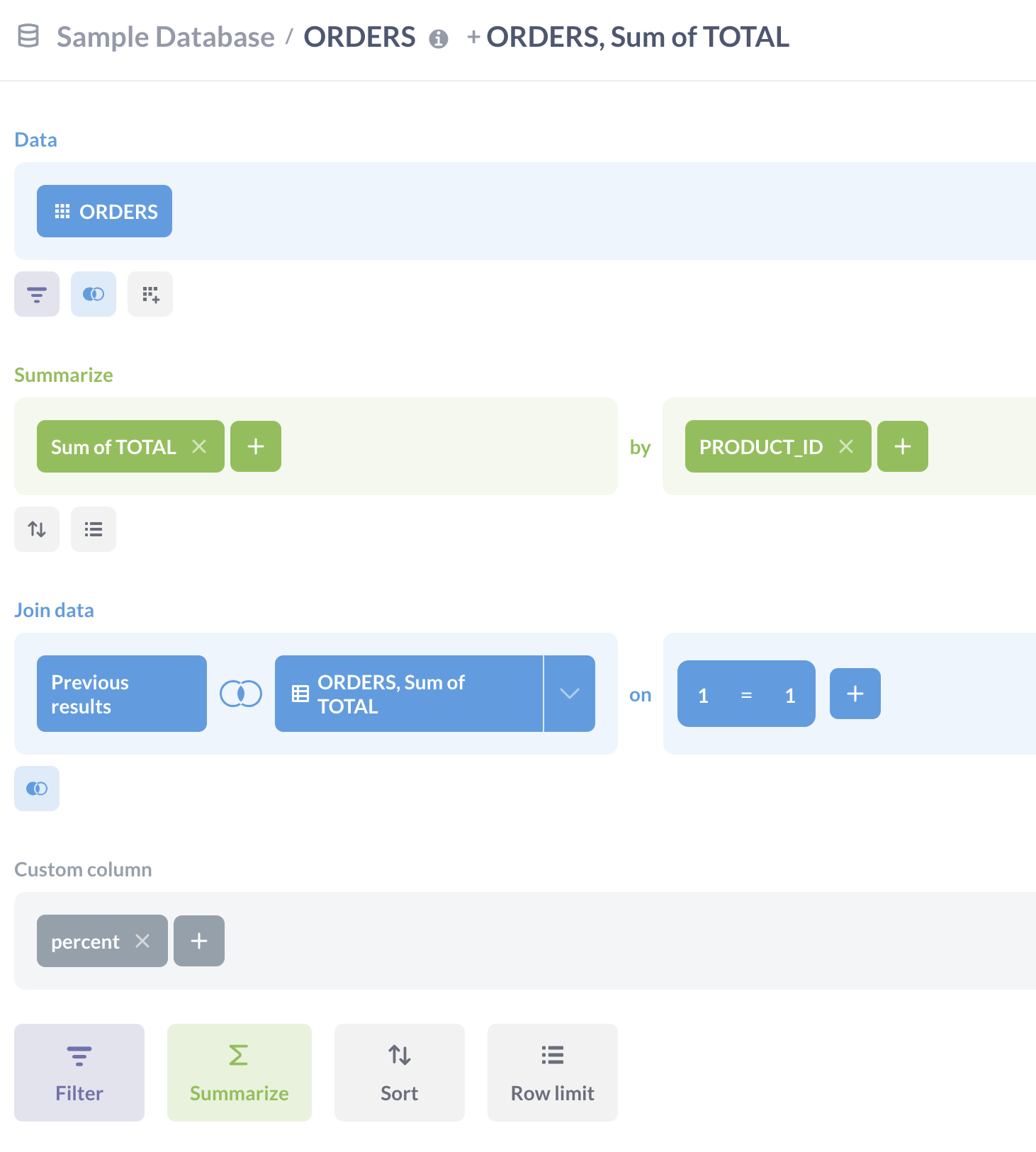 Write a new question that calculates the total sum of the column you want to base the percentage on. In this case we’re going to build a percentage of total sales by product, so sum all the TOTALs. Save it.