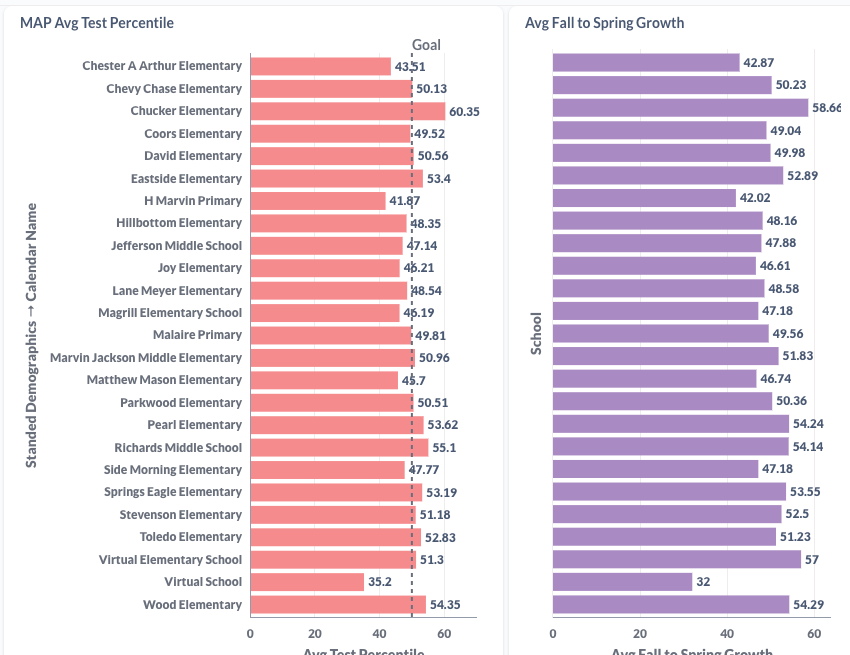 I'd want to put the below dataset into the quadrant where the chart on the left in red would be the X-axis and the chart on the right in purple would be the Y-axis. The middle would be 50% with schools showing greater than 50% in both charts would show up in the upper right of the quadrant, etc, etc.
