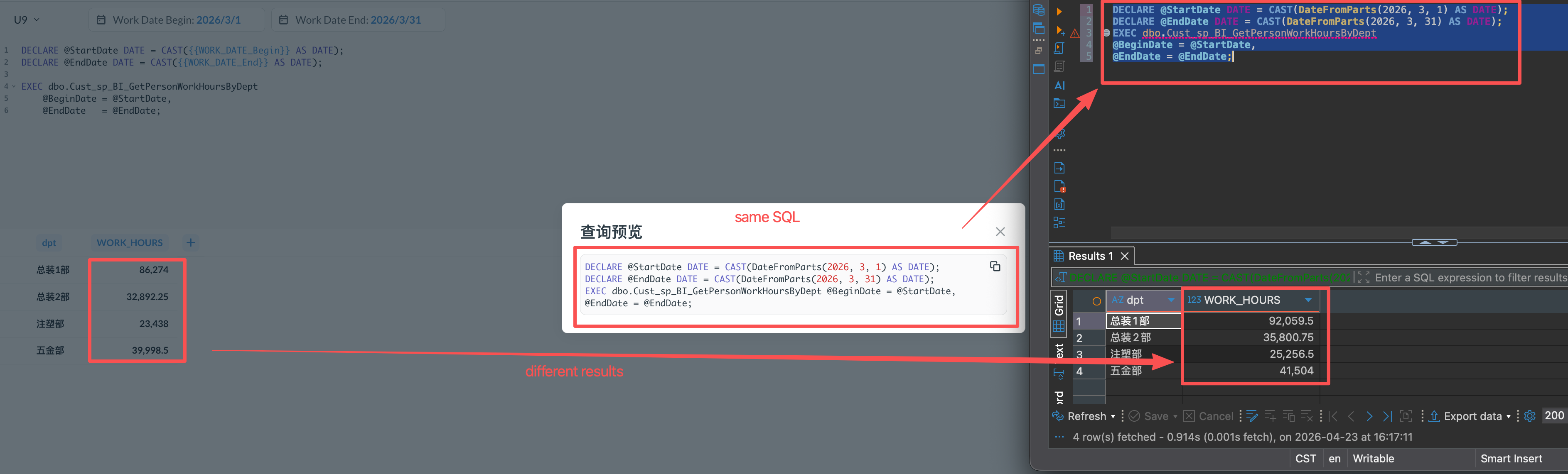 When running the identical stored procedure via Metabase and direct SQL queries separately, the output returned by Metabase is inaccurate.