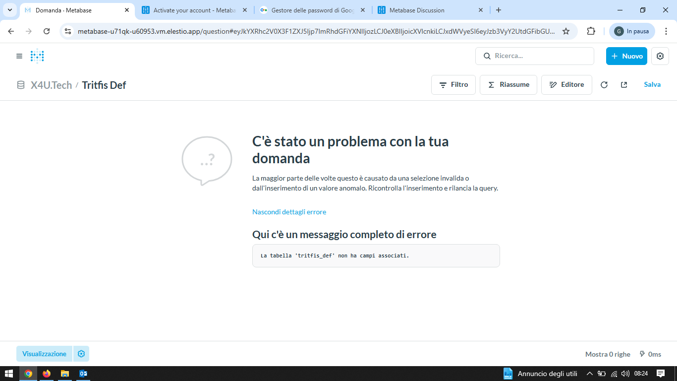 [a42de786-c3f0-4205-a2ee-18189372487e] 2025-12-14T15:43:40+01:00 WARN metabase.sync.util Error syncing Fields for Table ''Table 252 ''tritfis_def'''',clojure.lang.ExceptionInfo: Errore durante l'esecuzione della query: (conn=34005880) Unknown column 'generation_expression' in 'field list' {:driver :mysql, :sql ["SELECT" " `c`.`column_name` AS `name`," " `c`.`ordinal_position` - ? AS `database-position`," " NULL AS `table-schema`," " `c`.`table_name` AS `table-name`," " IF(" " `column_type` = 'tinyint(1)'," " 'BIT'," " UPPER(`c`.`data_type`)" " ) AS `database-type`," " `c`.`extra` = 'auto_increment' AS `database-is-auto-incr...,
