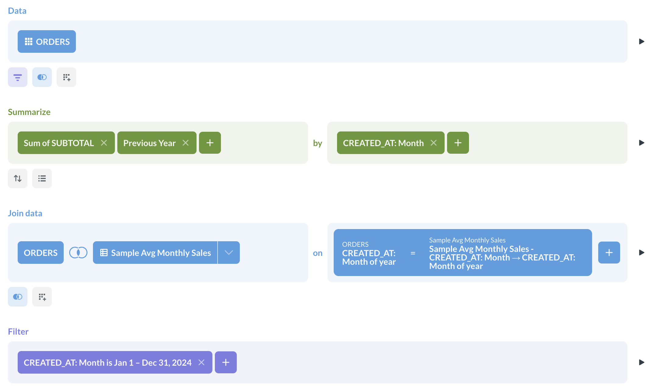 To incorporate a monthly average, either calculate it in a separate question and join it to your base question (which is what I did here), or use a SQL query with a window function. If you’re joining the questions, join on the dates binned by “Month of year.”